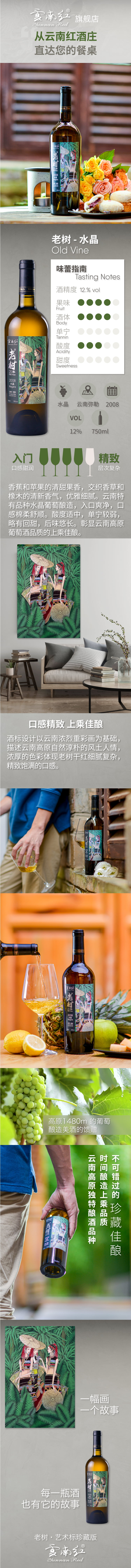 香蕉和苹果的清甜果香,交织香草和橡木的清新香气,优雅细腻。云南特有品种水晶葡萄酿造,入口爽净,口感棉柔舒顺。酸度适中,单宁较弱,略有回甜,后味悠长。彰显云南高原葡萄酒品质的上乘佳酿。