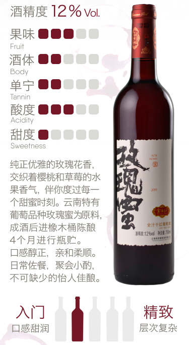 纯正优雅的玫瑰花香,交织着樱桃和草莓的水果香气,伴你度过每一 个甜蜜时刻。云南特有葡萄品种玫瑰蜜为原料,成酒后进橡木桶陈酿 4个月进行瓶贮。 口感醇正,亲和柔顺。日常佐餐,聚会小酌,不可缺少的怡人佳酿。